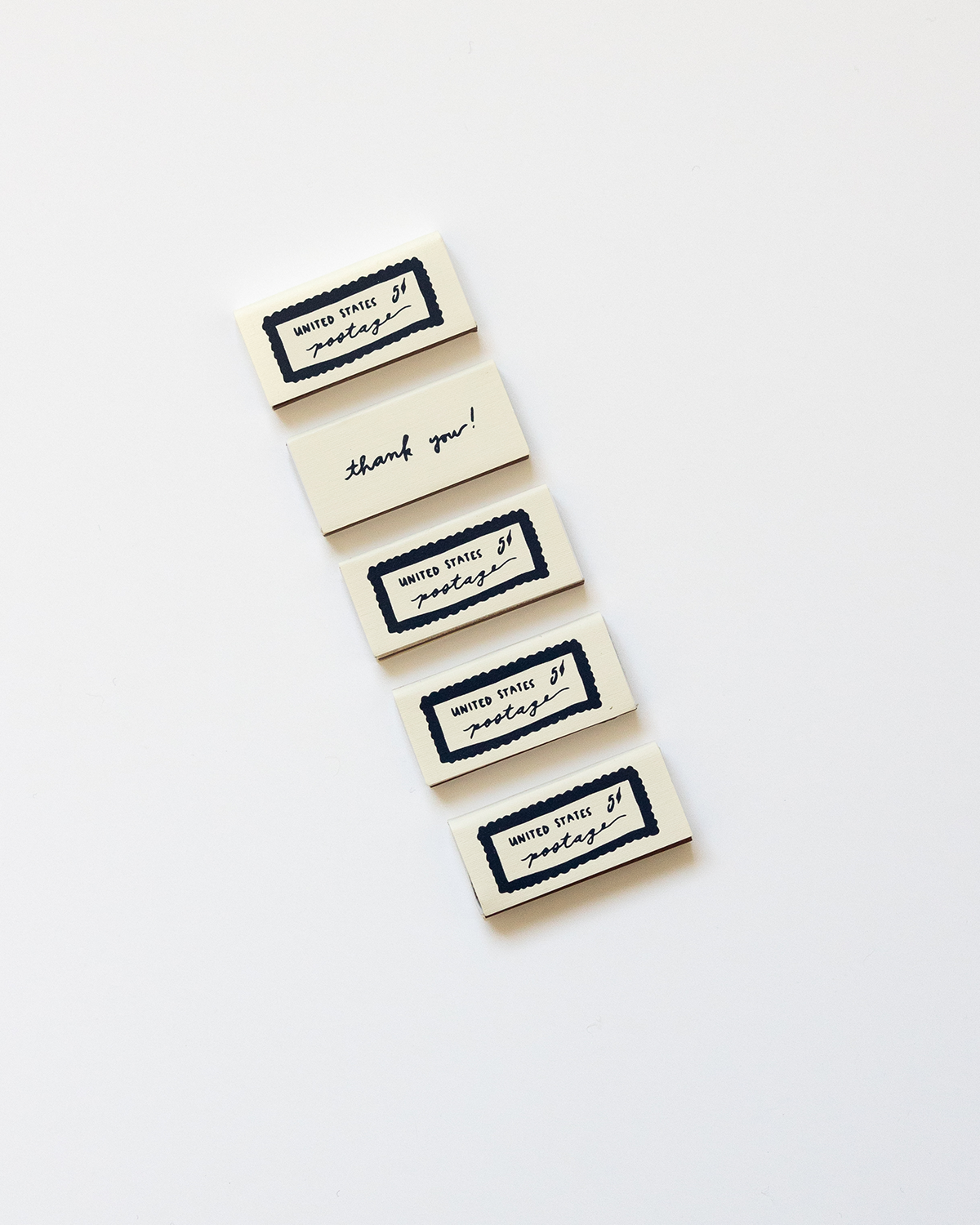 Our matchbox features a charming design that says "Thank You!" in a playful font, accompanied by a cute decorative postage stamp on the back. It's a fun touch that adds to any thank you gift.