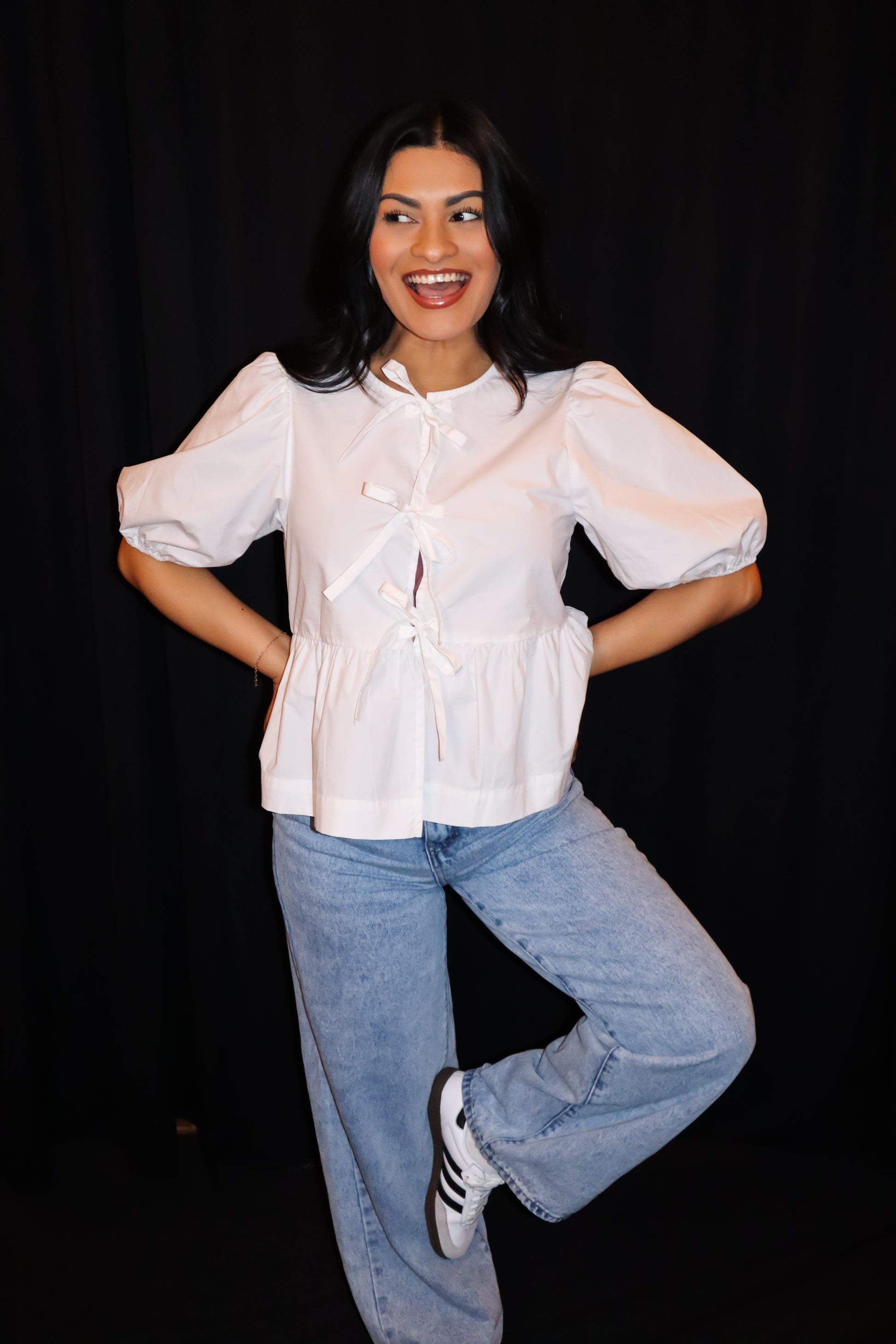 Add a sweet touch to your wardrobe with our Sweetheart Bow Peplum Blouse.