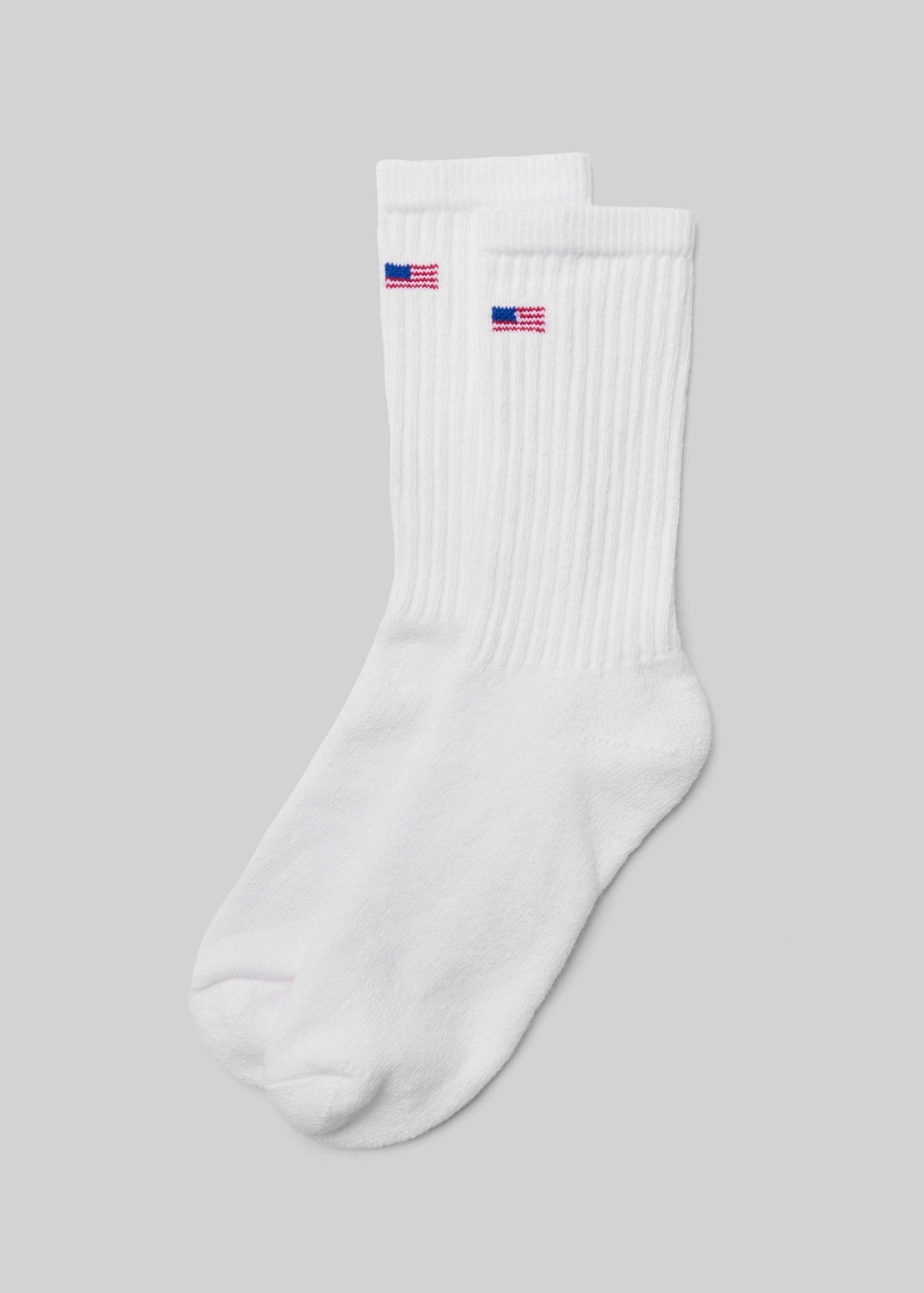 The Flag Crew is available as a 2-pack in limited quantities, this white crew is a bit longer than our standard Retros with an intarsia-knit flag and full-cushioned terry footbed.