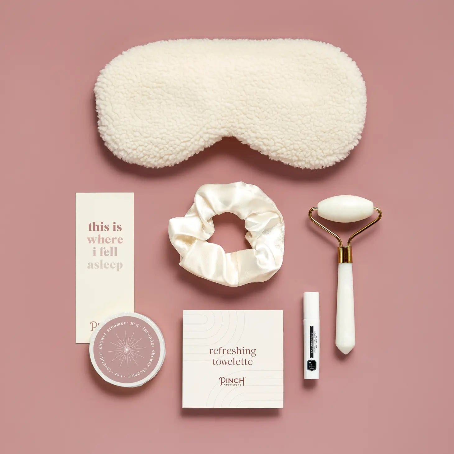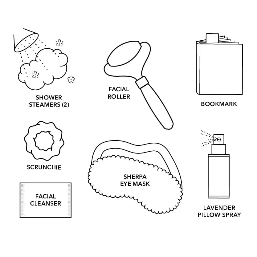 A super-soft ivory sherpa pouch and sleep mask are accompanied by a full suite of soothing, me-time essentials: stone facial roller, silky scrunch, lavender mist, refreshing towelette, bookmark, and 2 lavender shower steamers.