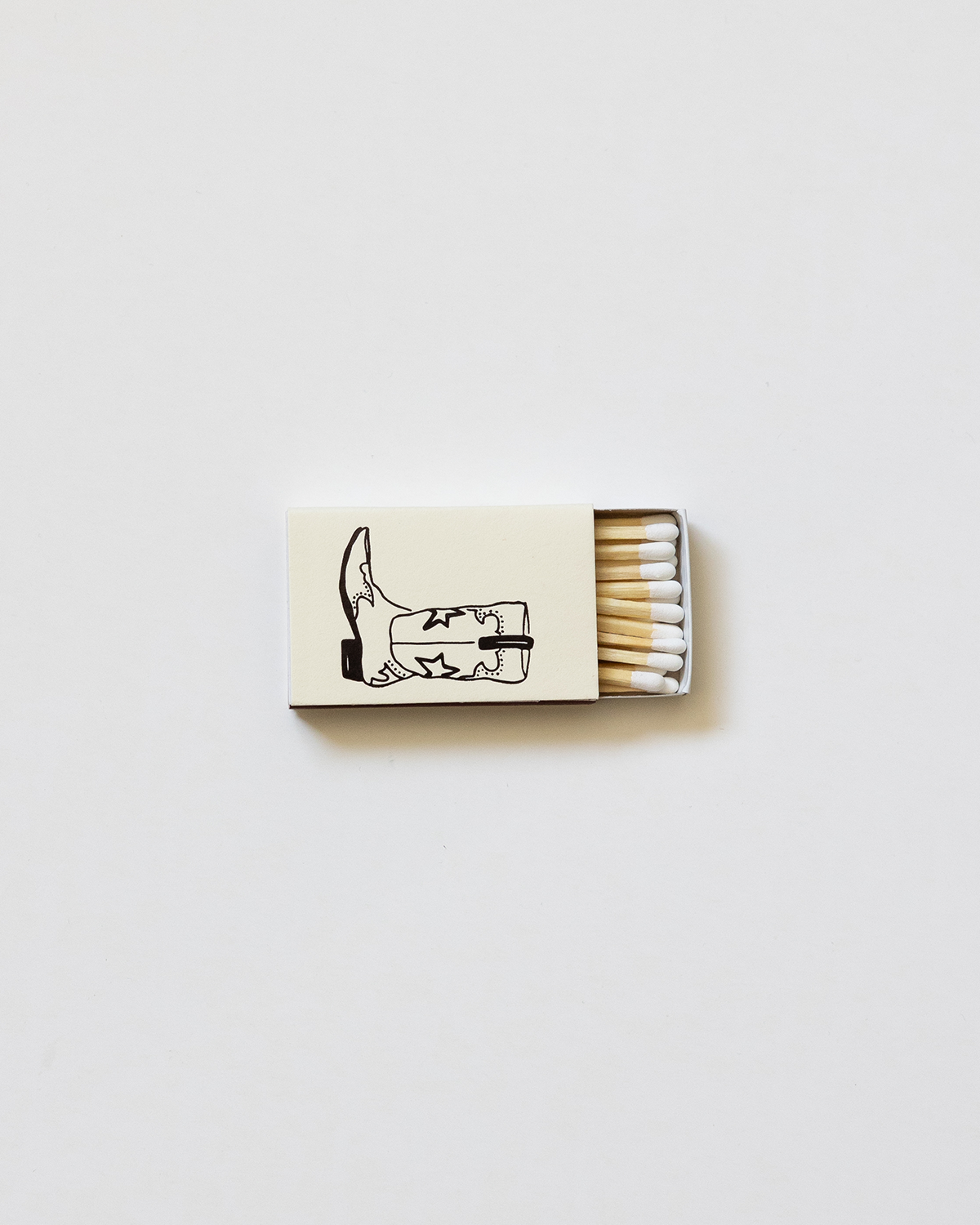 With a cute cowgirl boot and horseshoe illustration, this matchbox makes a trendy and unique gift. The ivory paper and black ink add a touch of sophistication, making it perfect for any occasion. Yeehaw!