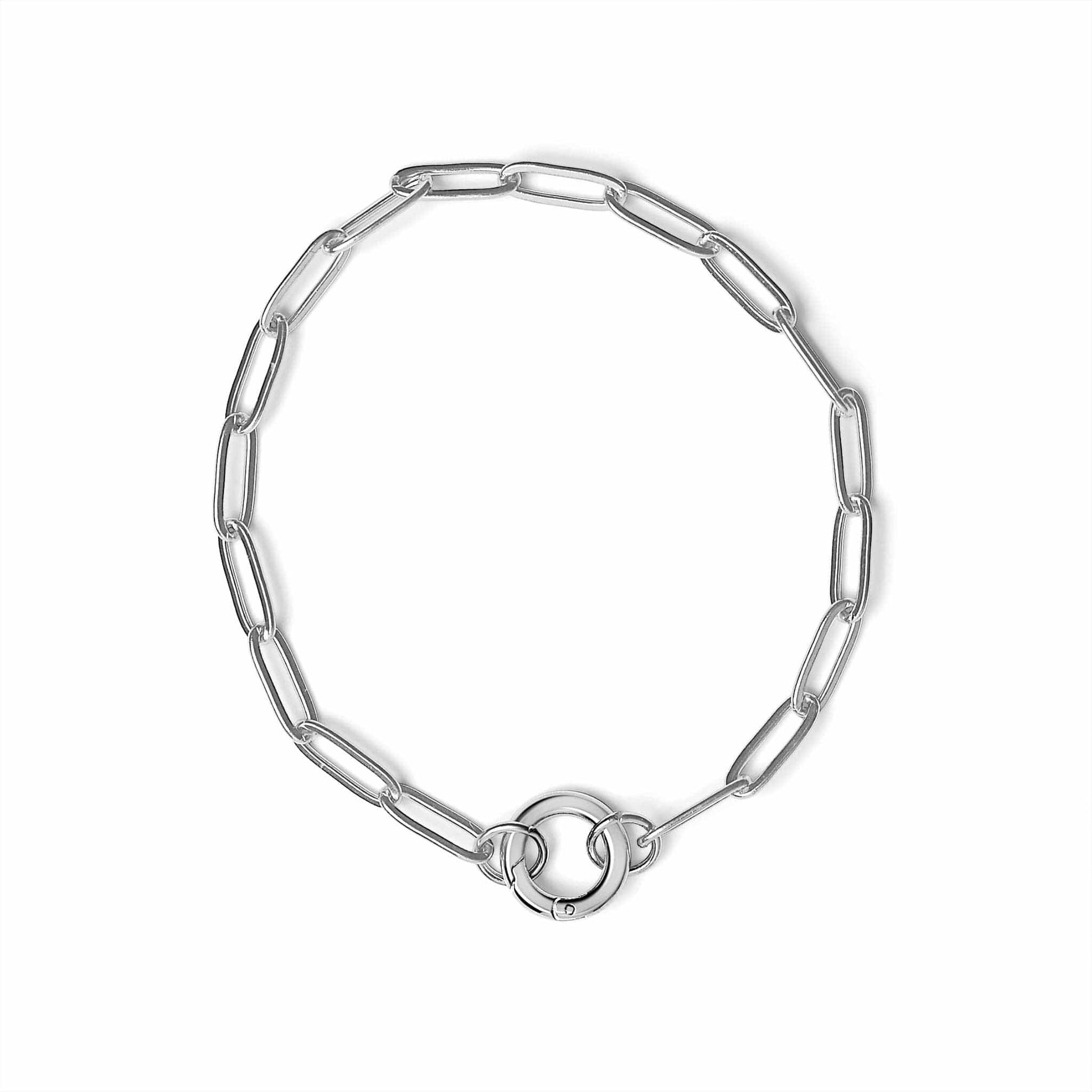 This modern paperclip chain design offers versatile, minimalistic styling that easily transitions from day to night. With a convenient charm keeper centerpiece, you can add your own personal touch to this sleek and comfortable bracelet.